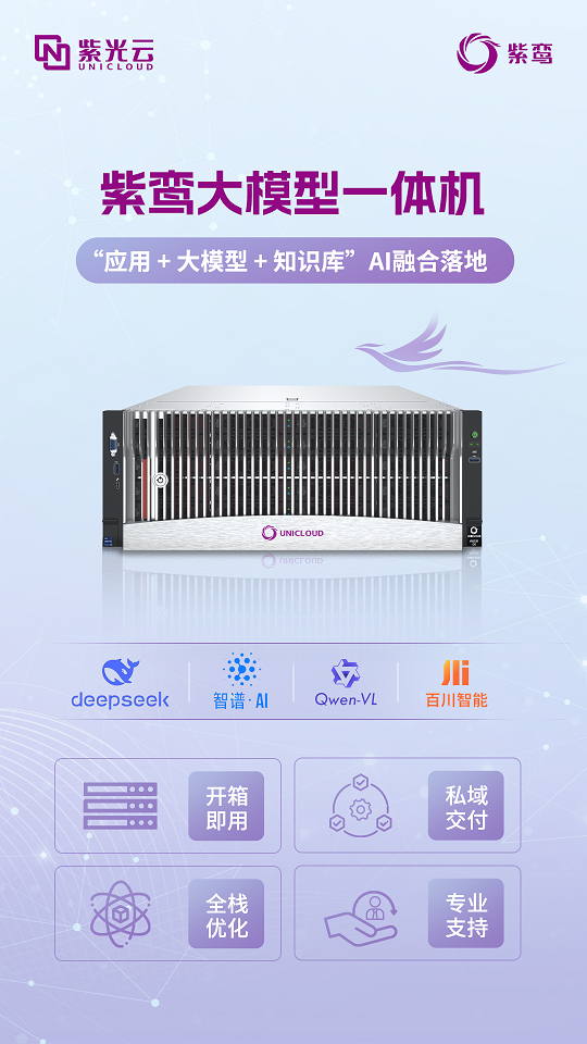 紫光云聚焦于“应用 + 大模型 + 知识库”的AI融合落地,紫鸾大模型一体机为用户提供全流程MaaS服务,实现了对DeepSeek R1,Baichuan2,Qwen2,GLM-4,LLAMA等大模型的开箱即用,通过整合“芯,网,云,数,智”纵向全栈能力,AI赋能,创新引领,紫光云打造政企行业专属私域智能方舟,保障AI能力高效,可控 蜜桃亚洲AV无码一区二区三区,安全落地。